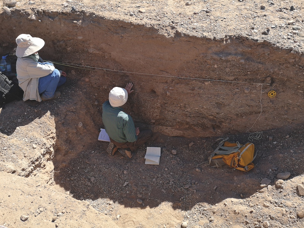 | Analyse d’une section dans l’une des tranchées creusées à la perpendiculaire dans le canal d’irrigation à ciel ouvert daté de la fin du 4e millénaire avant notre ère (cliché : C. Castel) © Mission archéologique de Bāt/Al-Arid (Oman). | Découverte d’une hache en cuivre in situ dans l’atelier métallurgique Hafit (cliché : C. Castel, 2023) © Mission archéologique de Bāt/Al-Arid (Oman) |